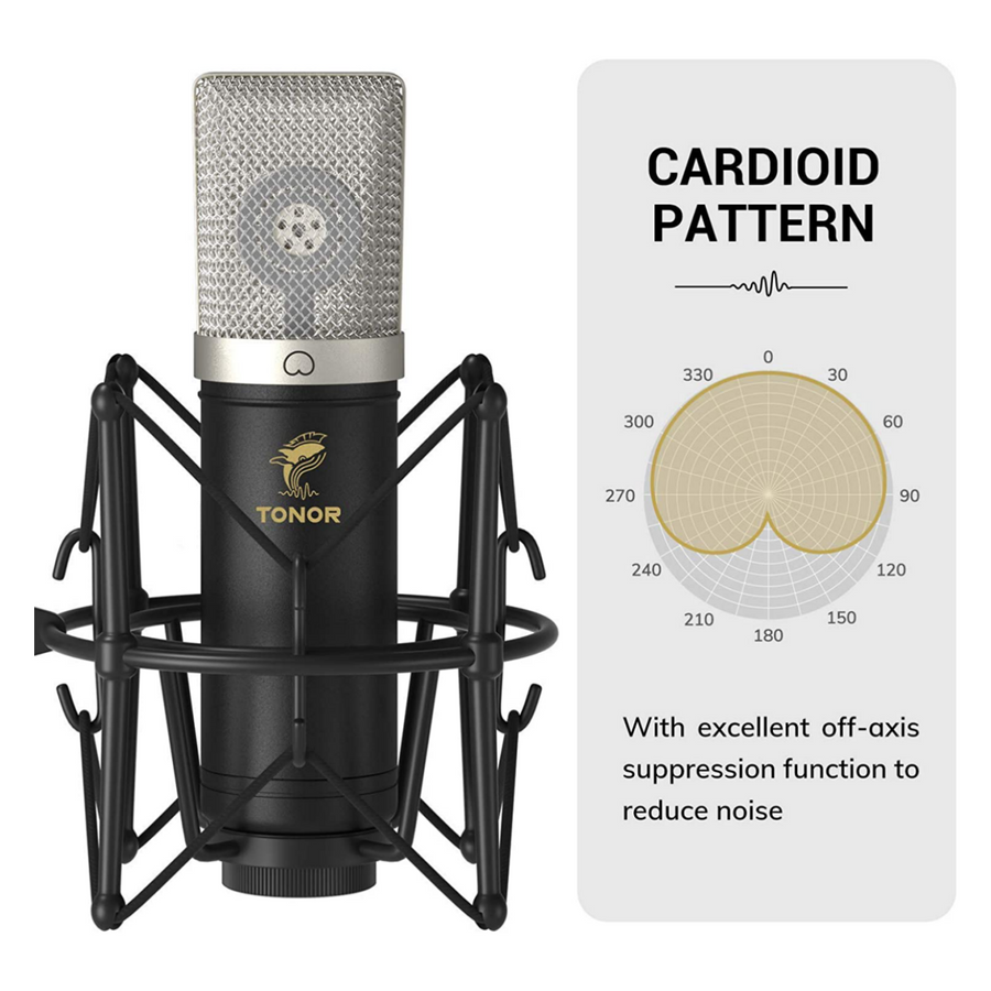 Gold-plated 14MM large-diaphragm makes the microphone sound range of low and high frequency wider and the sound quality more exquisite. Smooth 20Hz-20KHz frequency response, low distortion, 192kHz/24Bit sampling rate, giving you better sound quality, excellent for voice/video/instrument recording, voice over, podcast, and gaming.