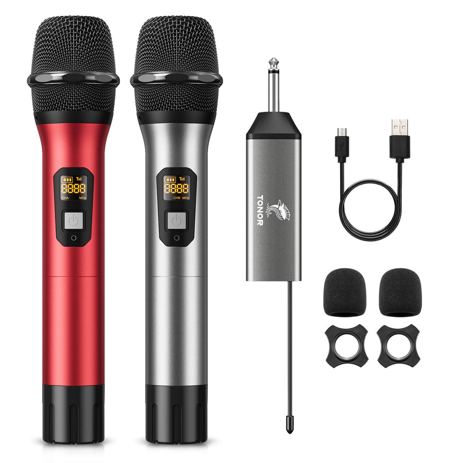 - What You Get: 2 x handheld microphone, 1 x receiver with a 6.35mm plug, 2 x anti-slip ring, 2 x mic cover, 1 x USB charging cable, 1 x manual. Note: 2*AA batteries are required for each mic (not included).