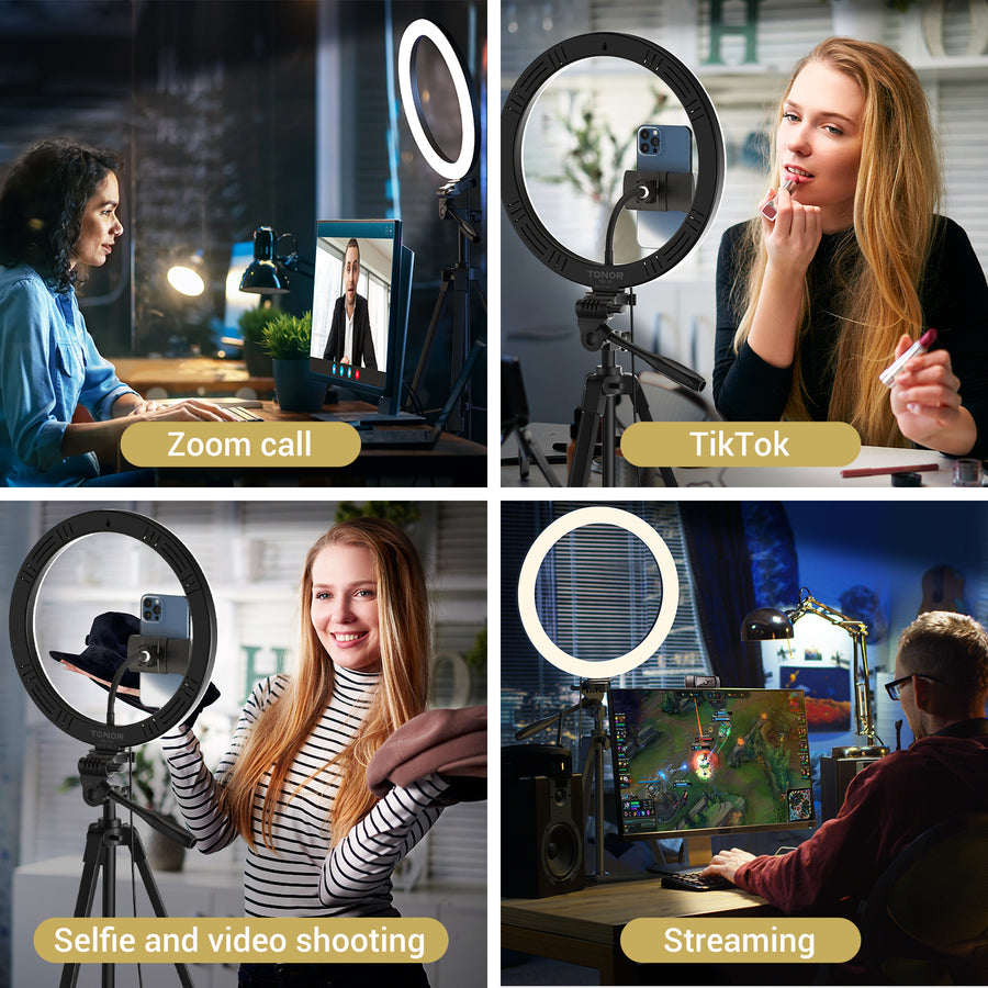 - Dimable Ring Light: TRL-20 features 3 color modes (cold, warm, natural) along with 10 brightness levels. The color temperature ranges from 2700K-6500K. Suitable for Zoom Conference, TikTok, YouTube, Makeup, Photographer.