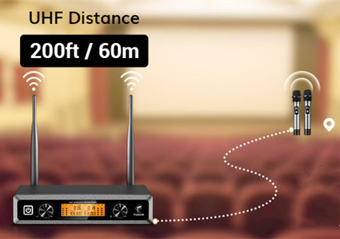 - Enhanced Signal Stability: With 15 adjustable frequencies per UHF mic and a long transmission range(60 m) in open space, ensuring that up to 15 sets can be used simultaneously without worrying about interferences.