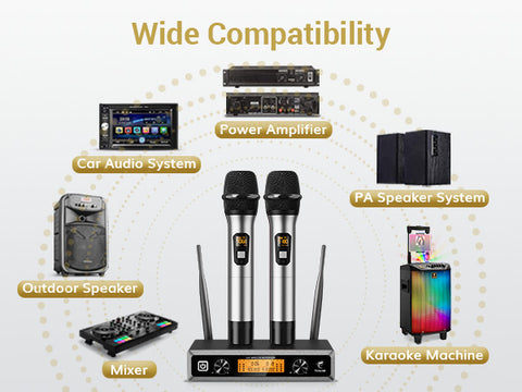 - Easy to Operate: Just turn on the receiver and mics, they will match automatically. Note: It is not compatible with laptop, iPad, cellphone and AV receiver. 2 x AA batteries (not included) are required for each mic.