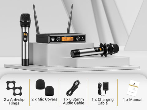 - What you get: 2 x handheld microphone, 1 x receiver, 2 x anti-slip ring, 1 x 6.35mm audio cables, 2 x mic covers, 1 x manual.